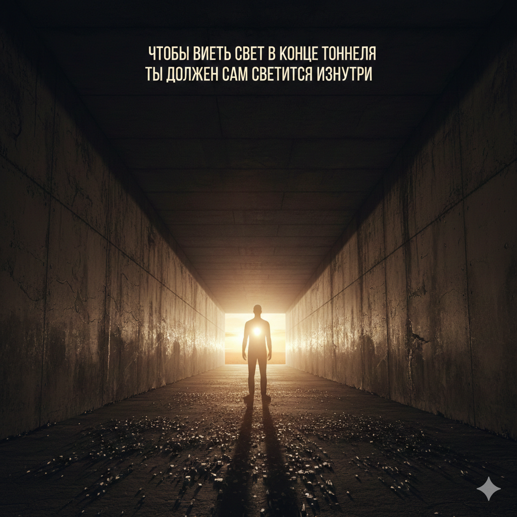 «Чтобы видеть свет в конце тоннеля, ты должен сам светиться изнутри» — это мысль о том, что надежду и выход из трудностей находишь благодаря собственной внутренней силе, вере и позитиву.